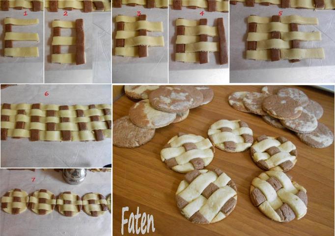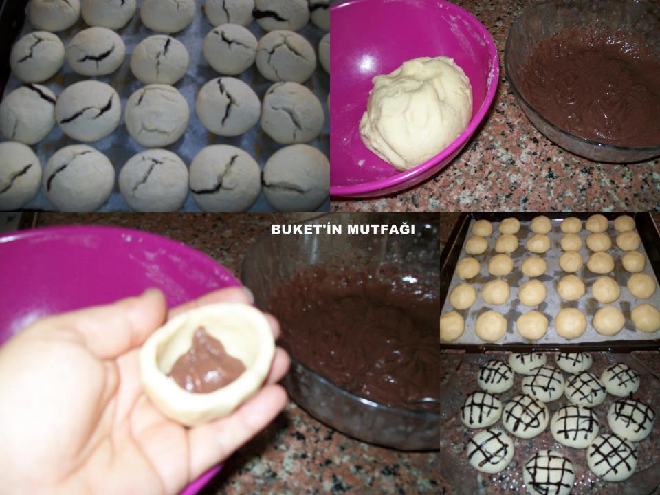 yarım paket margarin 1 su bardağı pudra şekeriyle iyice yoğrulur içine 1 yumurta kırılıp tekrar yoğrulur, 1 su bardağı nişasta 2 su bardağı un, vanilya,yarım paket kabartma tozunuda katıp iyice yoğurduktan sonra, hamurun 3/1 ni ayırıp kakao ile yoğurulur diğer hamura 1 bardak fındık içi katıp Sade parçaları avucunuzda yuvarlak hale getirip yassılaştırıp ortalarına kakaolu toptan koyup kapatın yuvarlak şekil vererek tepsiye yerleştirin.